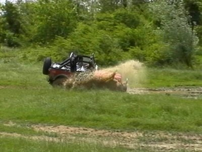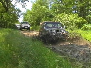 Andreas ließ seinen CJ langsam weiterrollen, bis die Scheinwerfer den Wasserspiegel erreichten. Ein idyllischer Fischteich hatte dank der reichlichen Regenfälle der letzen Tage den vorbeilaufenden Weg überflutet und zwang uns so zum Umkehren. Der nächste Einstieg ins Gelände kam wenig später. Diesmal schwankte der Zustand des Weges zwischen herzhaft hart und sehr weich. Bei strahlender Sonne und ausgezeichnetem Büchsenlicht für meine Kamera wühlten sich alle durch ein morastiges Gustostückchen.