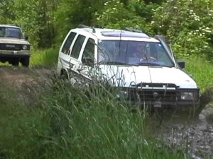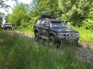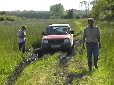 Daß man auch bei einer harmlosen Strecke versumpfen kann, wird von vielen bestritten. Heinz hat sich auf dem malerischen Wiesenweg das einzige Moorloch weit und breit gesucht, um seine Bodenfreiheit zu testen. Er hat sich um gut 5cm verschätzt und die alte Weisheit vom Ausritt mit mindestens zwei Fahrzeugen wieder bestätigt. |
