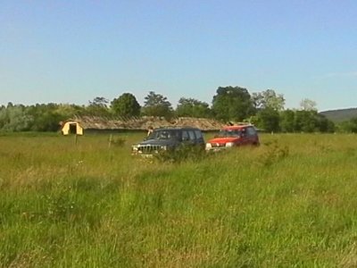 Für den nächsten Tag hatte ich einige Pfade in der Nähe von Heviz geplant. Gemeinsam mit Heinz in seinem neuen Toyota machten wir uns auf und folgten dem Zeiger des GPS wie einer Wünschelrute. Mich faszniniert immer der Übergang von der Karte zur Natur. Einiges ist sicher aus einer guten Karte ablesbar. Trotzdem bleiben genug Überraschungen. Als ich nördlich von Karmacs den Cherokee ins Gemüse lenkte, war ich genau auf Kurs und ,laut Karte, mitten auf einem wichtigen Wirtschaftsweg. Bloß die Landwirte der Gegend waren anderer Meinung und hatten den Weg ersatzlos gestrichen. Nach einigen Umwegen und Orientierungswanderungen fanden wir die Reste des Weges im Gestrüpp am Bach. Von dem "wichtigen" Weg war ein Pfosten für unerschrockene Bachquerungen geblieben. Wir suchten uns einen anderen Einstieg und waren kurz darauf wieder mitten im Grünzeug. Mit einer großen Schleife durch ein ehemaliges Militärgelände beendeten wir unsere Ausfahrt.