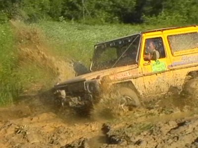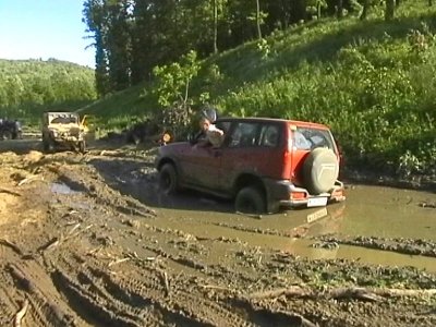 Langsam erwachte unser Hunger und wir beschlossen, die geplante Tour in Richtung Czarda zu verlassen. Seit fast 10 Jahren hatten wir in dem Lokal Pause gemacht. Heuer war es geschlossen und unsere Mägen knurrten mit den Motoren um die Wette. Das Pfingsttreffen in Somogybabod wird seit einigen Jahren von Deutschen und Ungarn gemeinsam veranstaltet. Diese Organisatoren haben es von einem Geländewagentreffen zu einem riesigen Volksfest mit off-road Einlagen gemacht. Wir umfuhren das Gelände in weitem Bogen und fanden ein Gasthaus mit deftiger Landküche. Die Hungrigsten aßen etwas hastig und waren nachher froh, in ihren Fahrzeugen Schwingsitze zu haben. Denn dann ging es auf Schleichwegen zum großen Schlammloch. Dort suhlten sich bereits etliche 100 Leute mit ihren Geräten. Wer keinen Geländewagen hatte, sprang einfach so uin den Gatsch. Nichts könnte größer sein als der Kontrast zwischen unserer Anreise auf ruhigen Orientierungspfaden und dieser alkoholgesättigten Massenverschlammung. Wobei einige von uns das mit dem Schlamm anscheinend genau wissen wollten und dem letzten feuchten Loch genüsslich auf den Grund gingen.