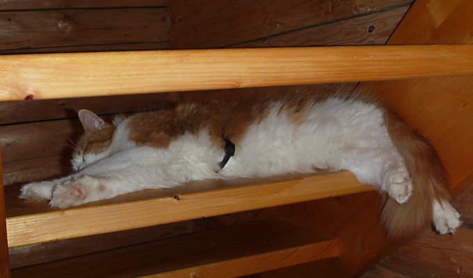Nach der herzlichen Begrüßung durch Margit Kern beziehen wir das Blockhaus am Teich als Heim für die nächsten vier Tage. Ein wenig Geschnüffel und Polo findet seinen Platz beim Tisch. Kater Merlin nimmt mit einem gründlichen Blick auf die Anlage die lauschigsten Plätzchen der Hütte in Besitz. Eine kleine Strolcherei in die Umgebung, ein nahrhaftes Abendessen, eine geruhsame Nacht mit warmem Katzenfell gegen eventuelle Rückenschmerzen, dann lockt uns der frische Tag mit dem Quad in den Wald.